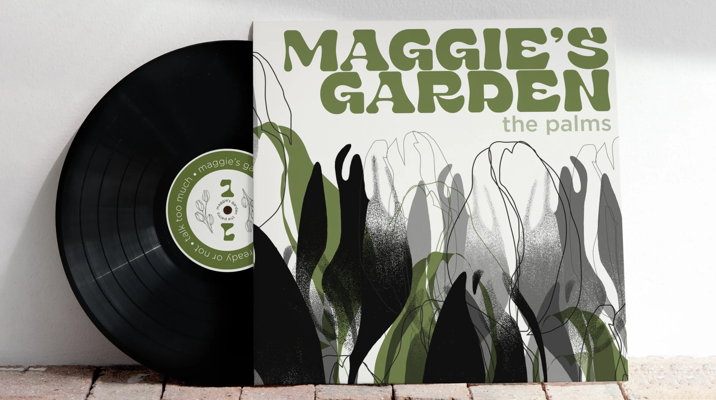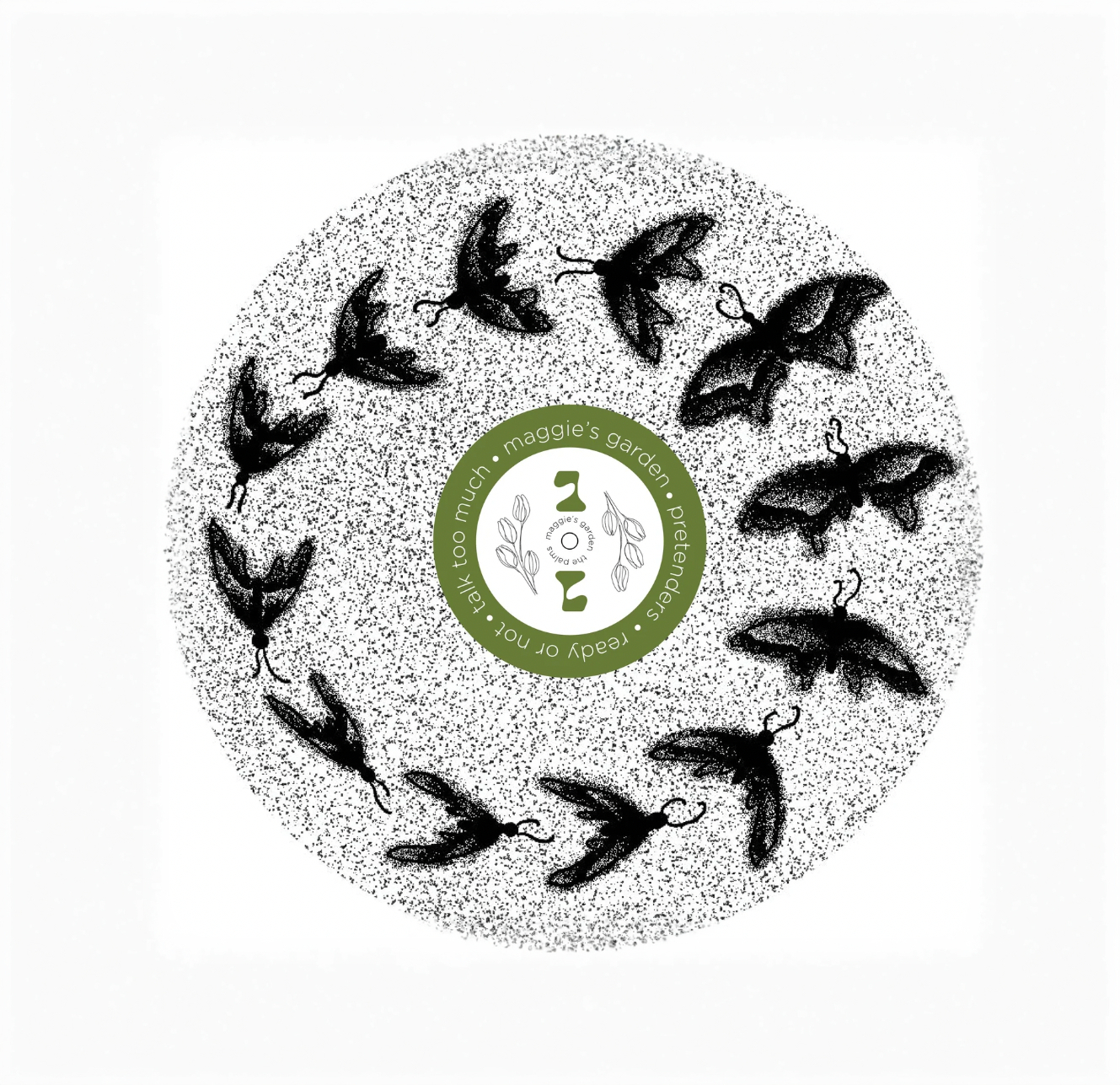 Each piece was created to work together as one system while incorporating different ambiguous elements. The stippled tulip design was crafted using procreate to add a stronger sense of ambiguity to the overall design. Using different variations of filled, outlined, and stippled tulips of all different values and colors, the design came together as a captivating piece that draws the eye in, yet challenges the brain. The typeface “Stora” was chosen to keep a sleek and clean look while “Gotham” was chosen as the body. Both typefaces are used consistently on both the front and back cover of the album along with the album labels. The zoetrope was systematically designed using the same stippling technique as the cover along with an illusion of a butterfly fluttering around the center of the vinyl. The album labels are intentionally the same layout in different colors so that they still work together in the system yet have different qualities to differentiate the two sides. Finally, the green color was chosen to add a slight pop against the overarching greyscale in the overall design and was integrated throughout each part of the series. All these elements work together to contribute to the style and flow of the project as a whole.