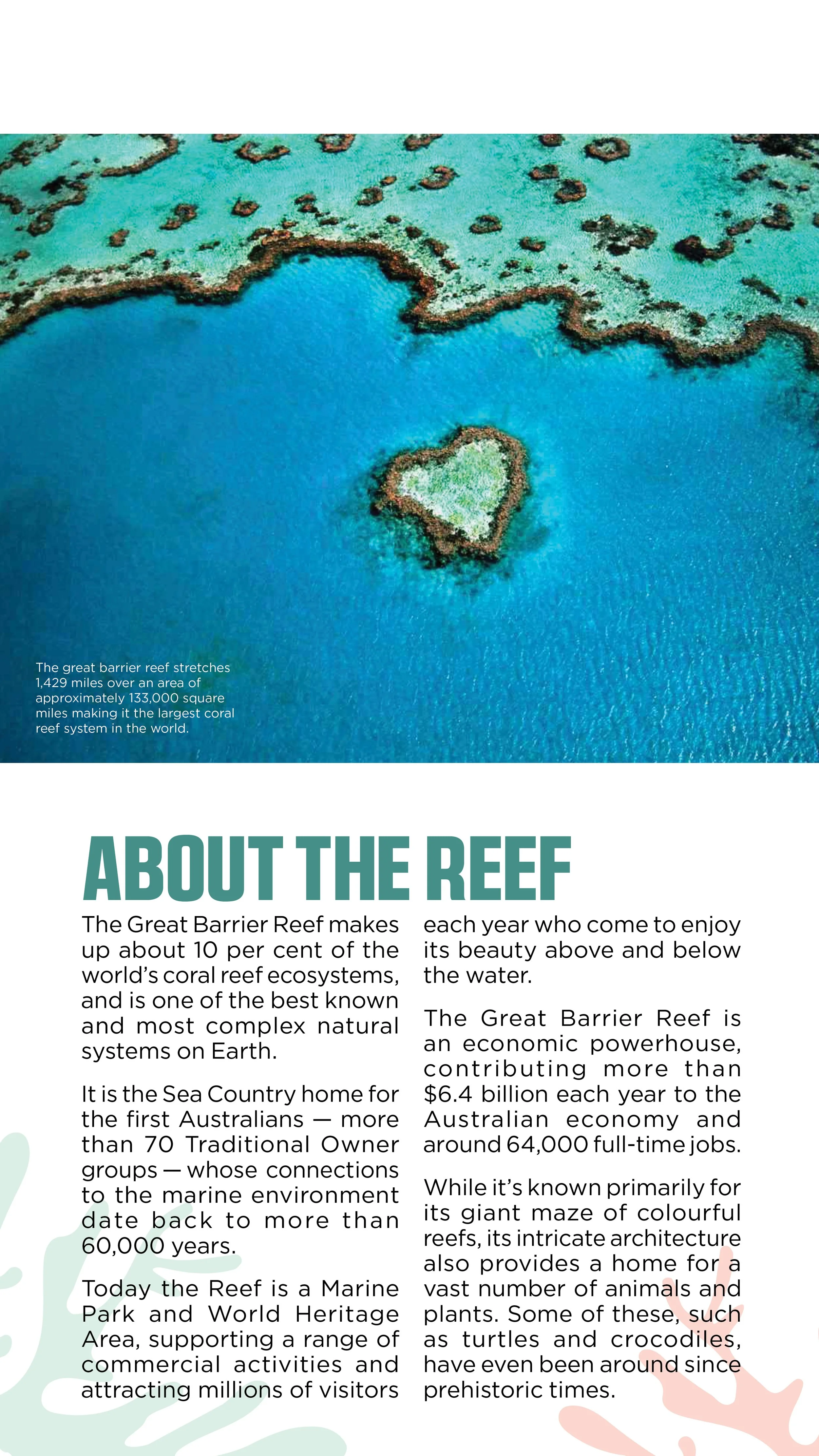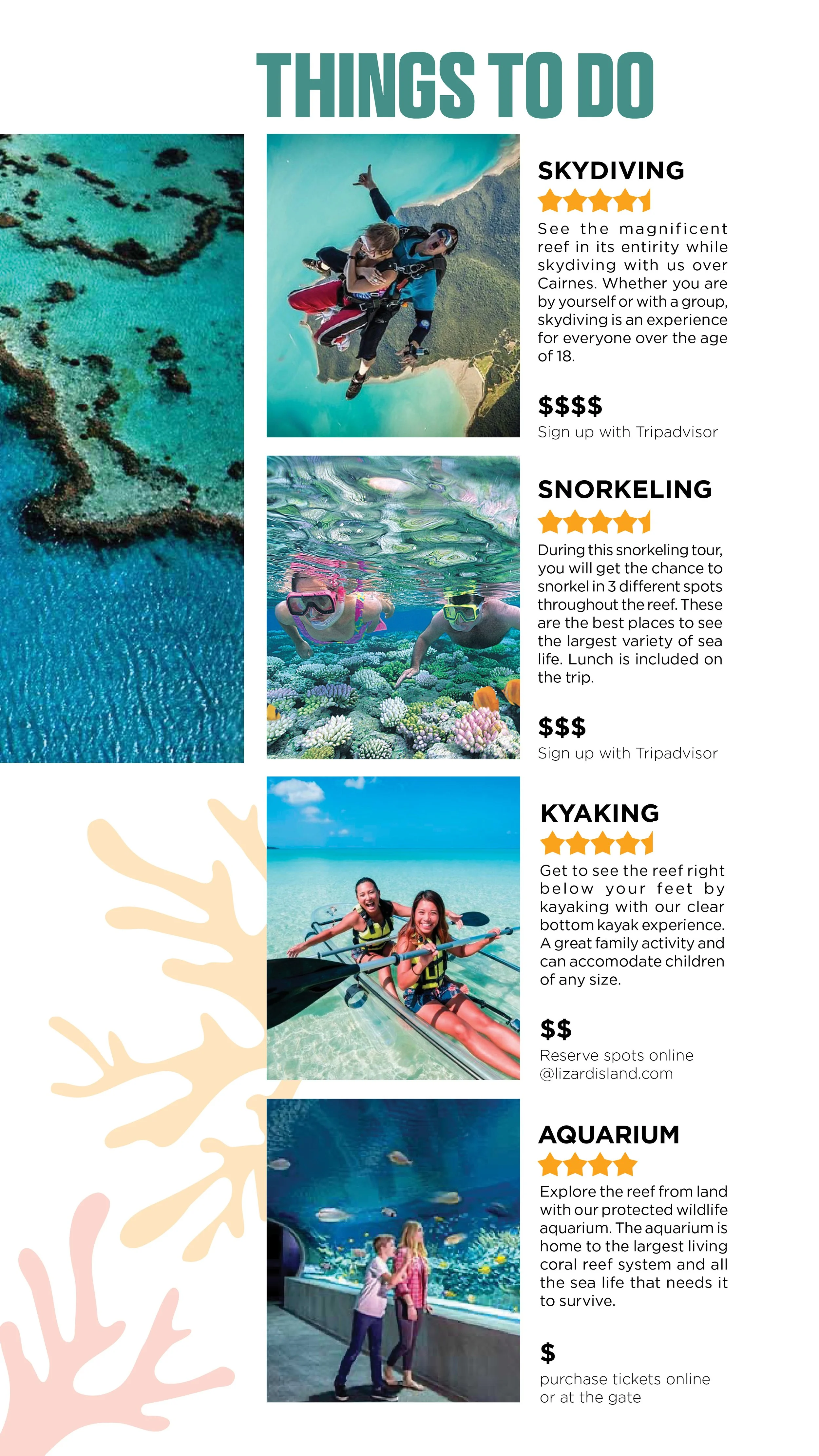 Inspired by the intricate reef system that makes up the Great Barrier Reef, the logo design is centered around a standard piece of coral that plays with background and foreground using color. The typeface “Avilock Bold” was chosen because of its bold symmetrical shape to complement the simplistic imagery in the logo. It also is intended to stand as the top level of hierarchy next to “Gotham Book” and “Gotham Light”. Integrating the logo into the brochure and choosing to fill the background of the logo using an image of coral gives the viewer a better visual representation of the Great Barrier Reef and adds a sense of intrigue to the cover page. The use of color, typefaces, and imagery are key to creating a successful system not only in the brochure but also in the stationery set. Throughout all the elements, there is repeated use of the same coral shape displayed in the logo. Patterns were made using this shape along with the designated color scheme. The color scheme was chosen to resemble the vast variety of color that is seen throughout the entirety of the reef and the sea life surrounding it.
